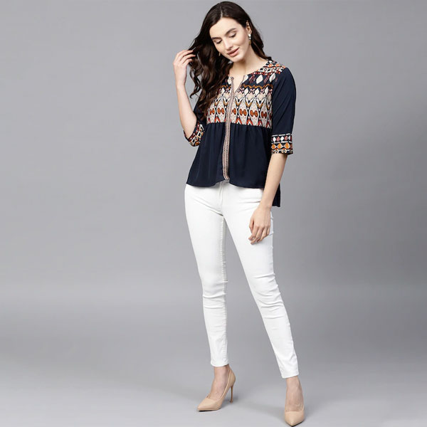 Navy Blue Ethnic Motifs Pleated Keyhole Neck Top